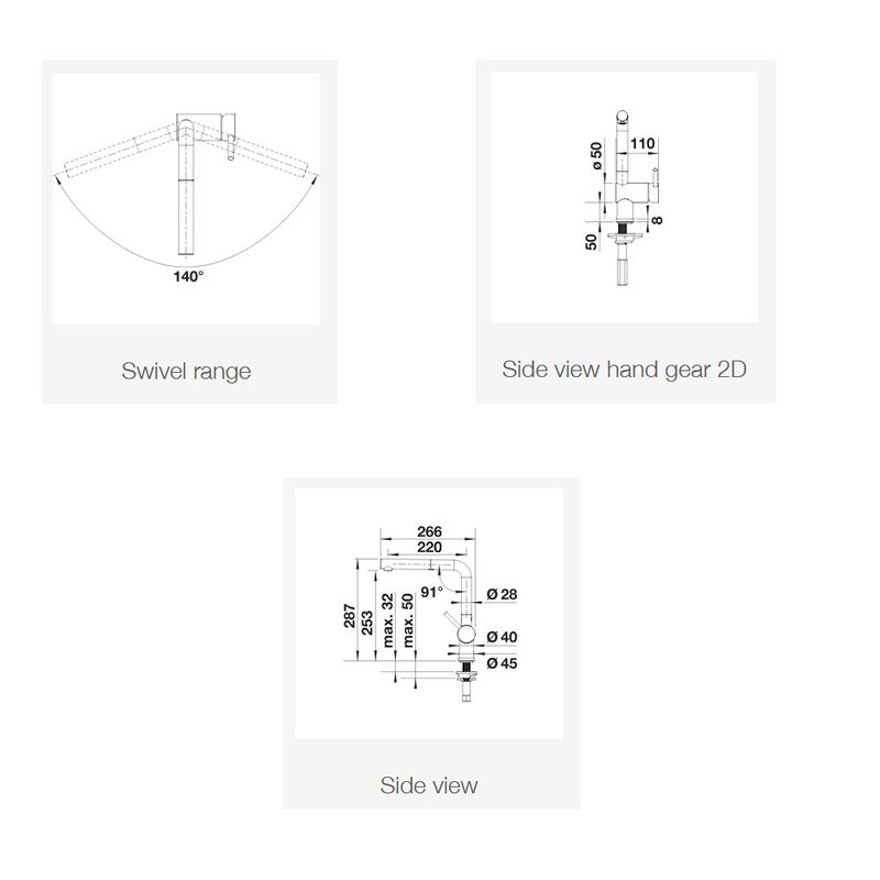 Dimensions : 140° swivel range