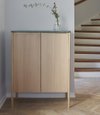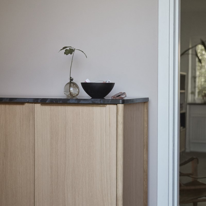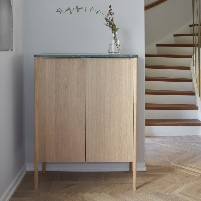 The round legs placed at the outer corners and the sleek brass handles give Jut a light and graceful expression. The shelves of the cabinet are adjustable with fittings on the inner side. Jut High Cabinet is suitable in almost any room, adding contemporary Nordic functionalism to the practicality of storage. The tabletop comes in either oak or marble – both materials known for their beautifully vivid structures. The round legs placed at the outer corners and the sleek brass handles give Jut a light and graceful expression. The shelves of the cabinet are adjustable with fittings on the inner side. Jut High Cabinet is suitable in almost any room, adding contemporary Nordic functionalism to the practicality of storage. The tabletop comes in either oak or marble – both materials known for their beautifully vivid structures
