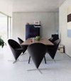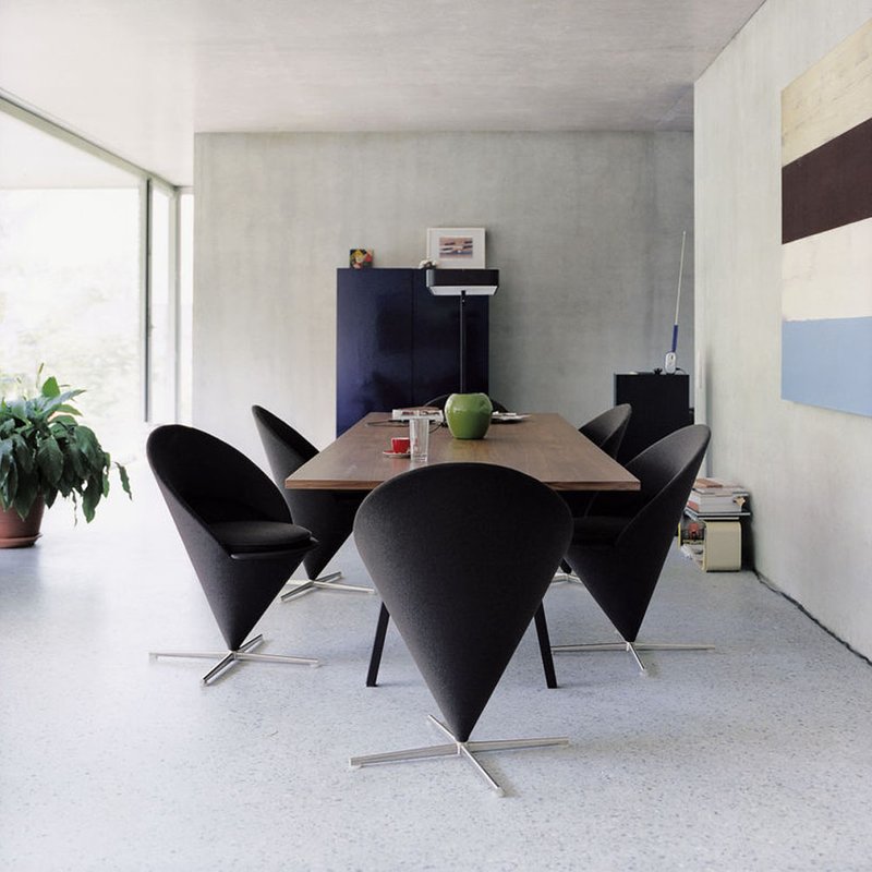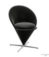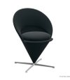 Verner Panton originally designed the Cone Chair for a restaurant in Denmark. It takes its shape from the classic geometric figure for which it is named. The padded shell forms the back and armrests and, together with the soft seat cushion, creates an exceptionally comfortable armchair, which is mounted on an elegant brushed or powder-coated stainless steel swivel base.