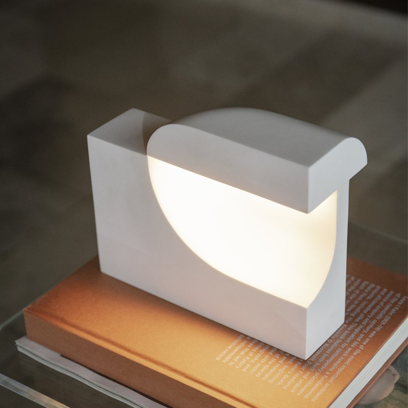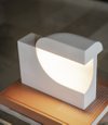 Moby is an extraordinarily sculptural table lamp. Filled with intriguing contrasts, it balances a soft and comforting light with a striking, futuristic design. The void in the main element creates a small cap in which the light source is enclosed. When Moby is on, the soft light unfolds and illuminates the cavity, immediately drawing the attention to the organic curves.